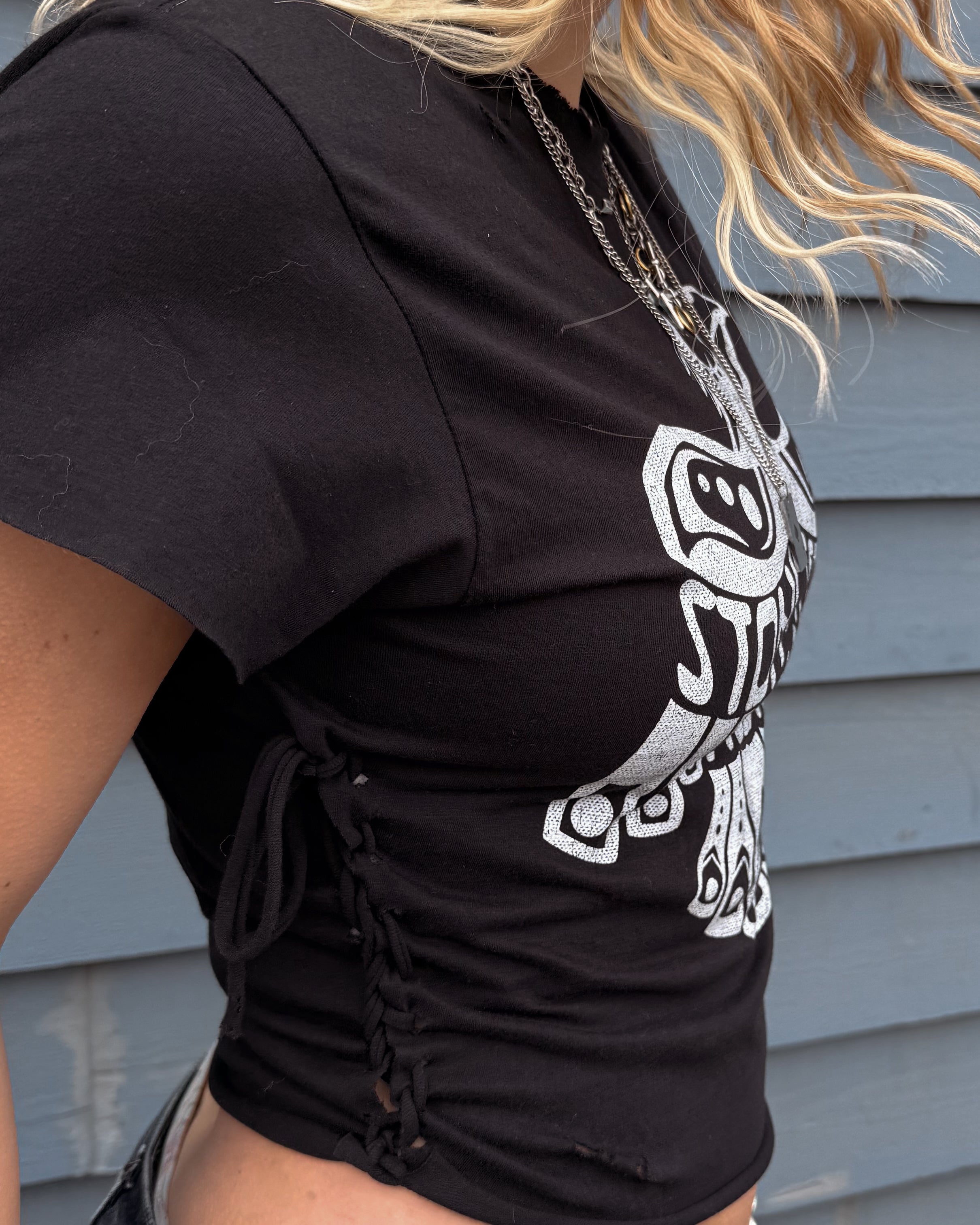 All Items are done in house. Our Chop Shop features one of a kind distressed, bleached, and dyed products done by one of our very own team members!