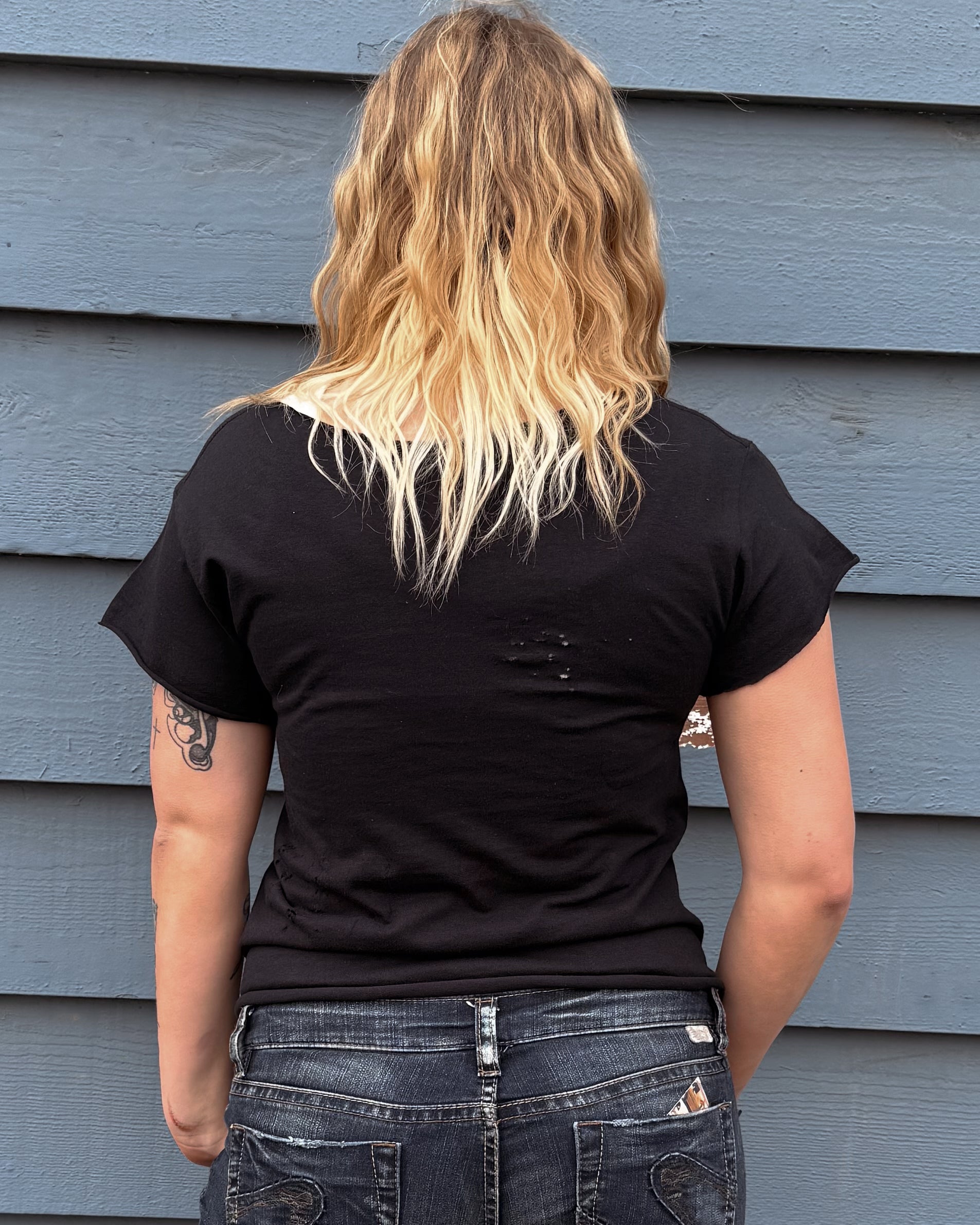 All Items are done in house. Our Chop Shop features one of a kind distressed, bleached, and dyed products done by one of our very own team members!