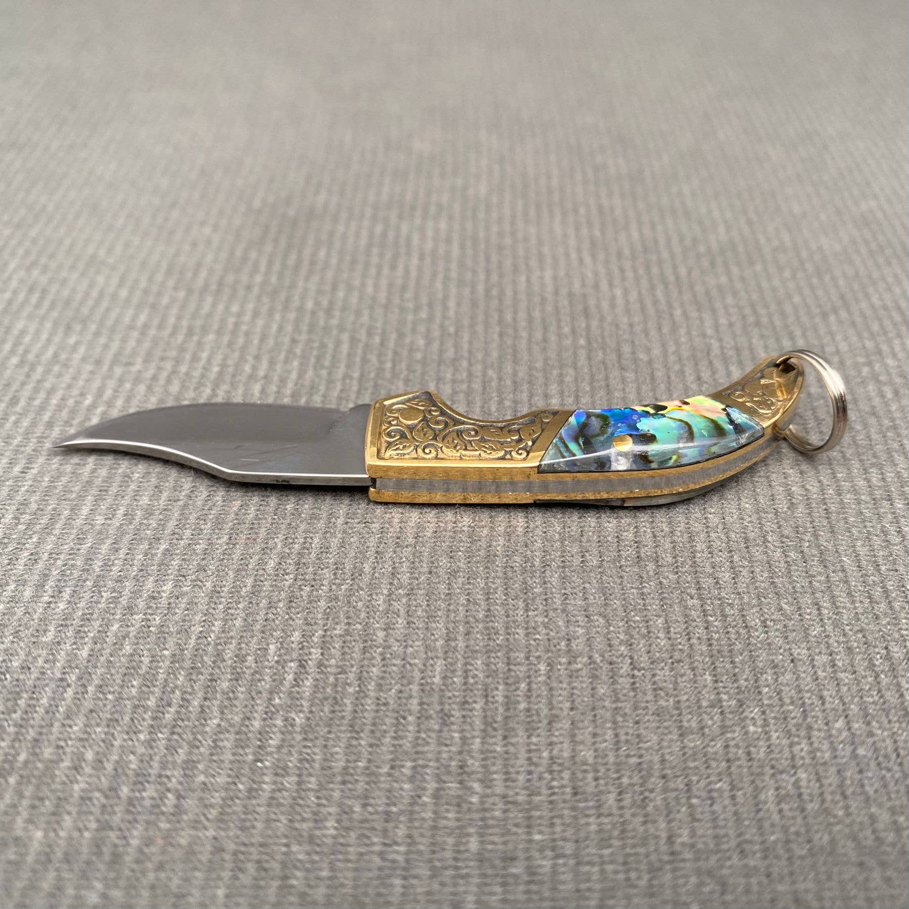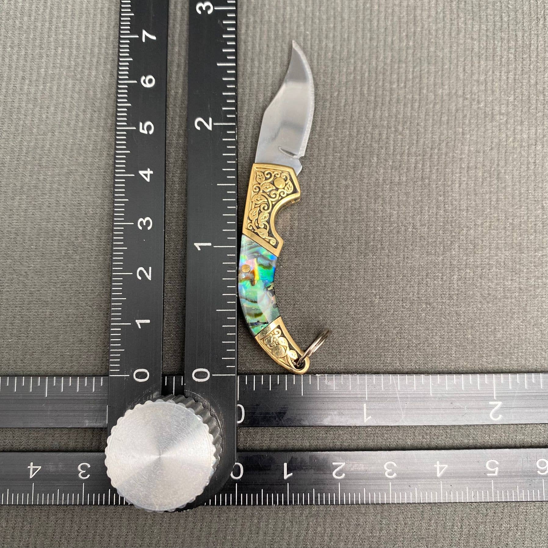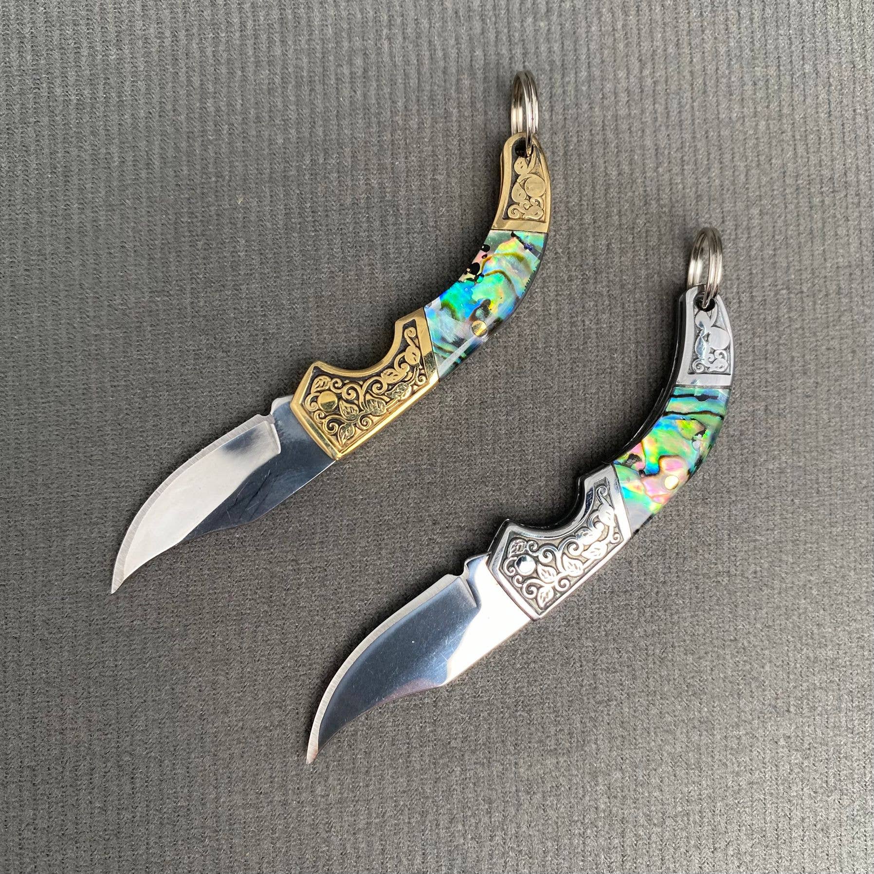 Our Abyss foldable mini knife is the perfect keychain addition. Use it to open packages, cut small items or food, or just as a decoration this piece is a slam dunk. Easy to store in your pocket or bag, this knife just folds right up.